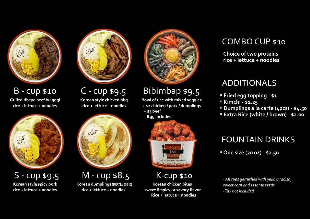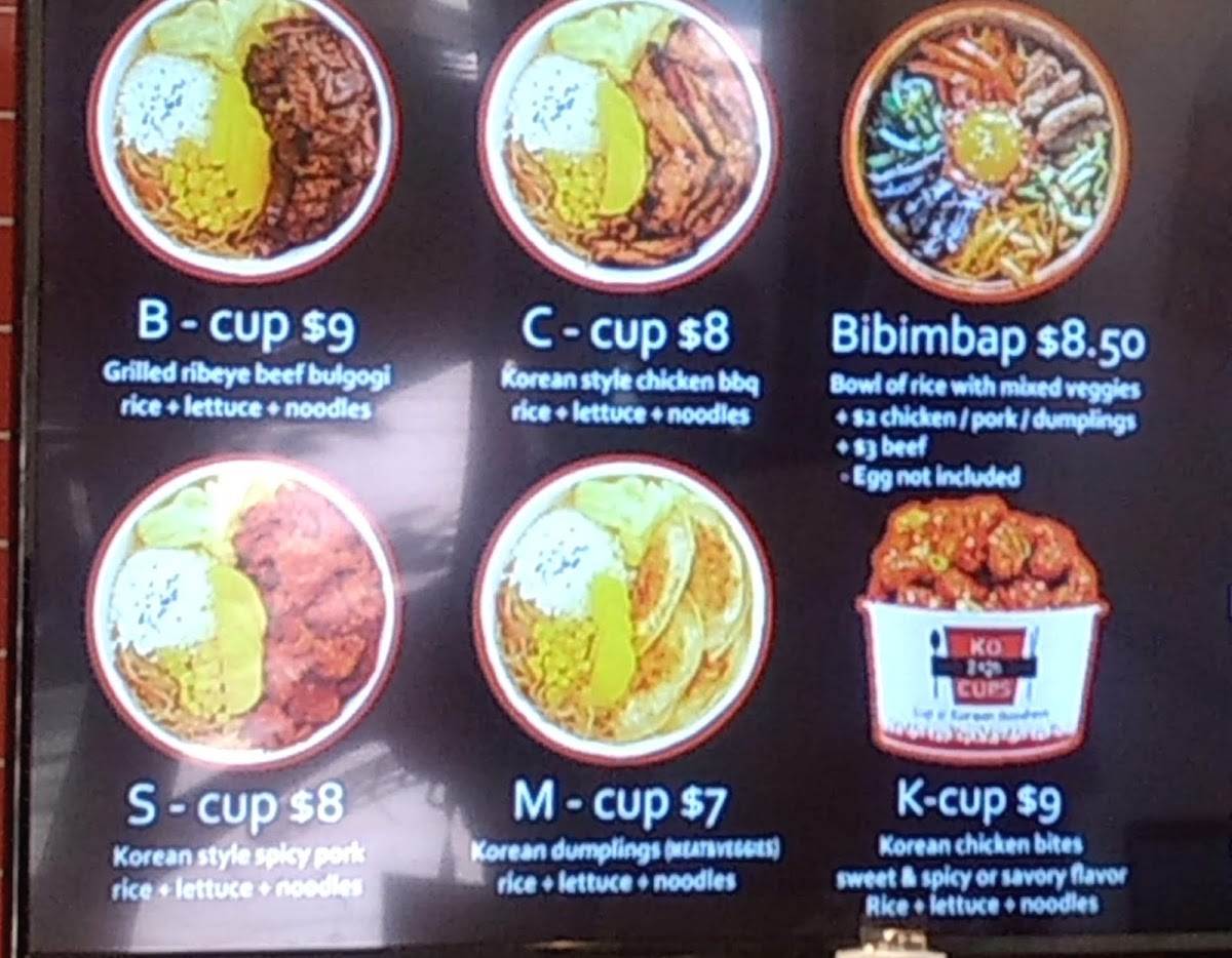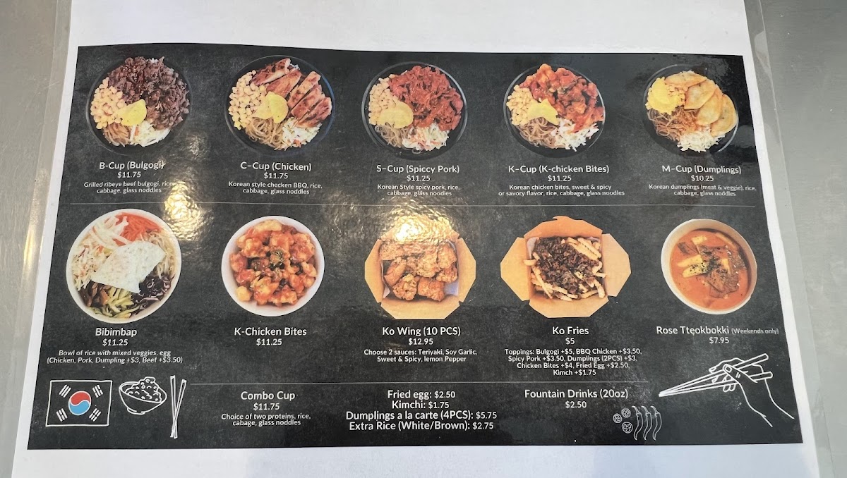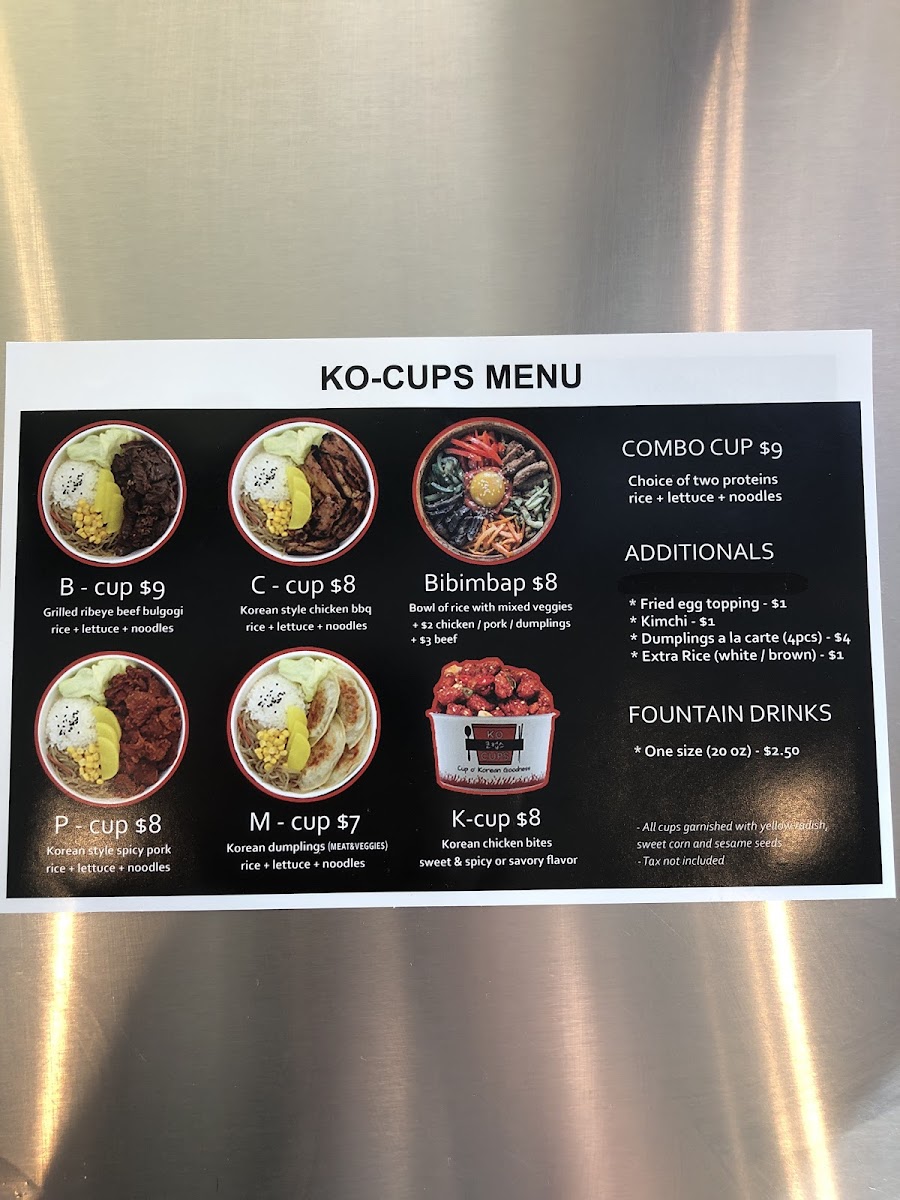 The menu offers a variety of Korean-inspired dishes and beverages, organized into several key categories. For food, the selection includes Ko Cups—rice bowls featuring proteins such as Korean chicken, beef bulgogi, spicy pork, and pulled pork—often accompanied by lettuce, noodles, or rice. There are also additional options like deep-fried dumplings, extra rice (brown or white), kimchi, and fried egg toppings that can be added to customize meals.
