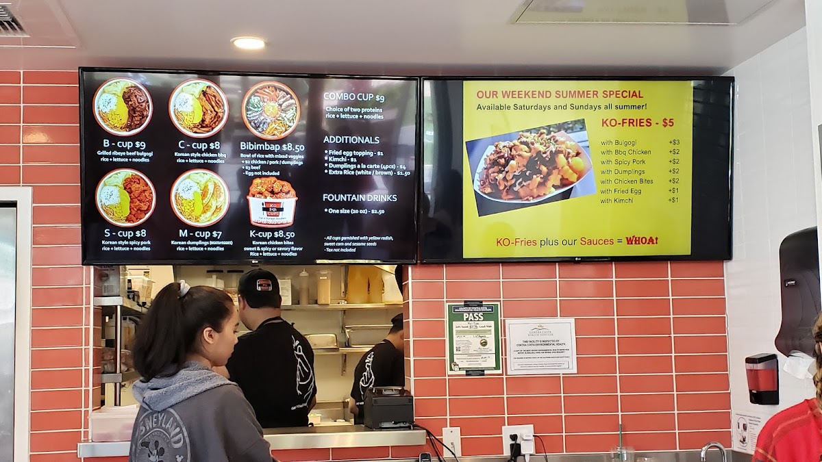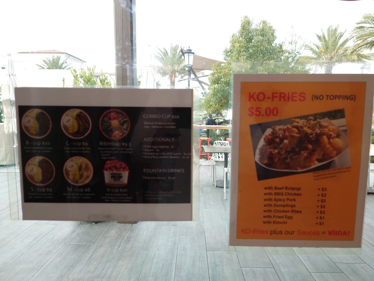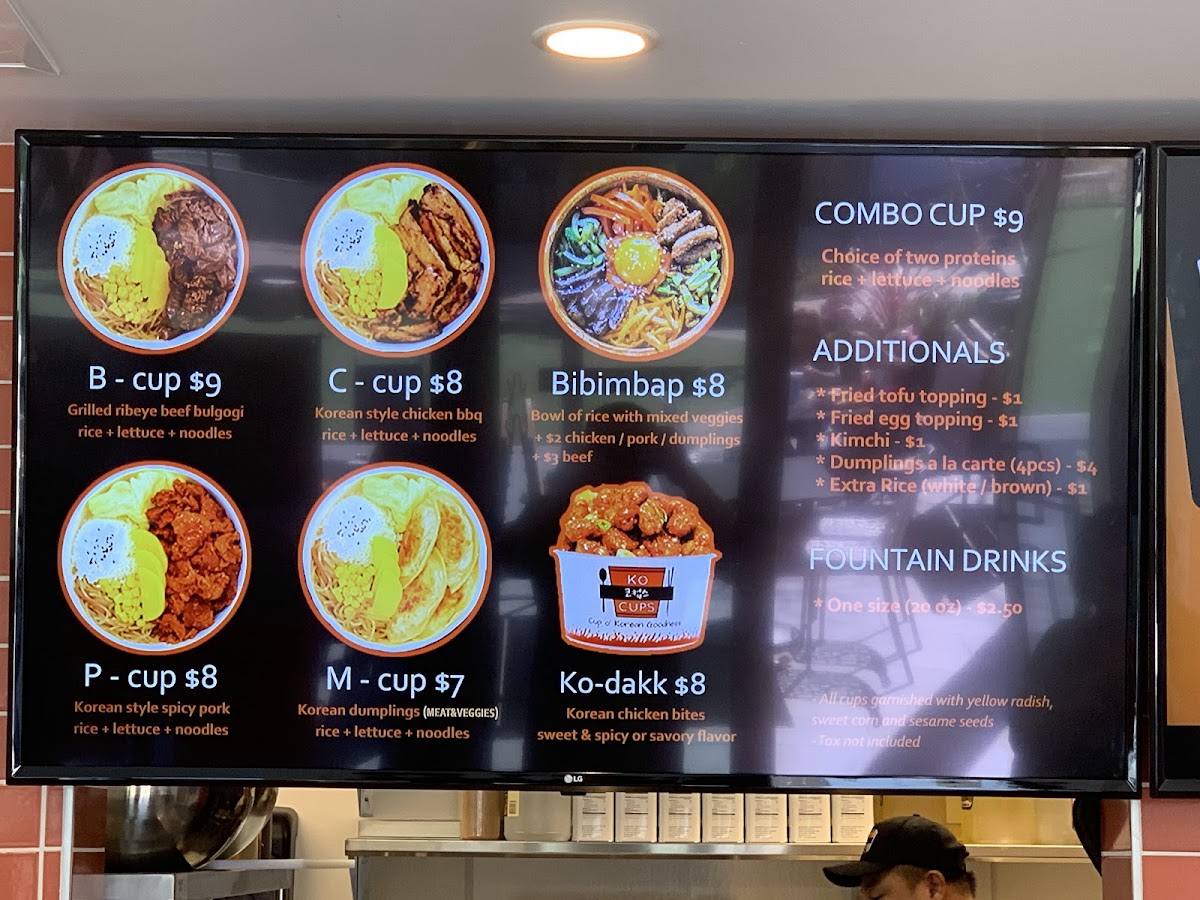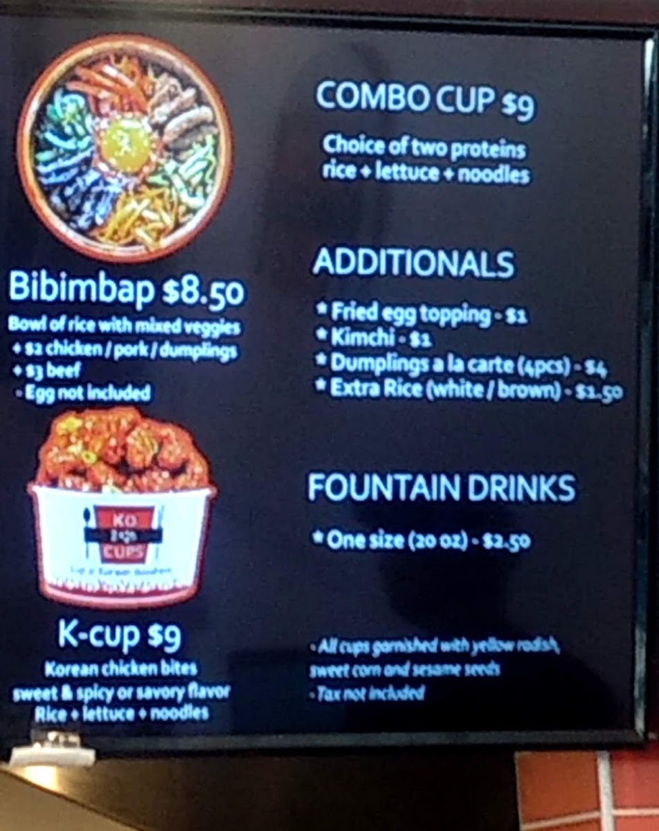 The menu offers a variety of Korean-inspired dishes and beverages, organized into several key categories. For food, the selection includes Ko Cups—rice bowls featuring proteins such as Korean chicken, beef bulgogi, spicy pork, and pulled pork—often accompanied by lettuce, noodles, or rice. There are also additional options like deep-fried dumplings, extra rice (brown or white), kimchi, and fried egg toppings that can be added to customize meals.